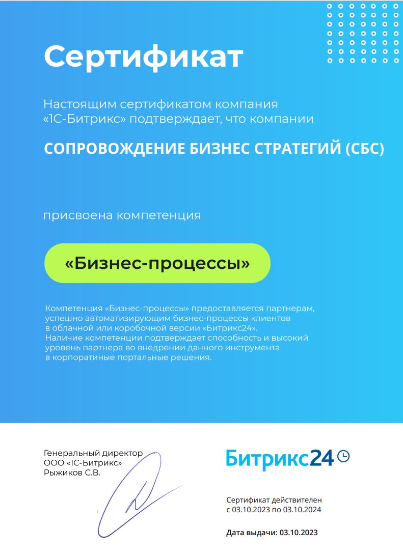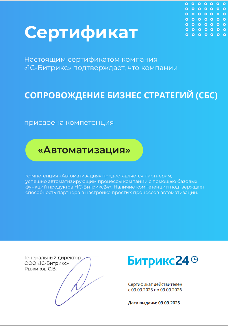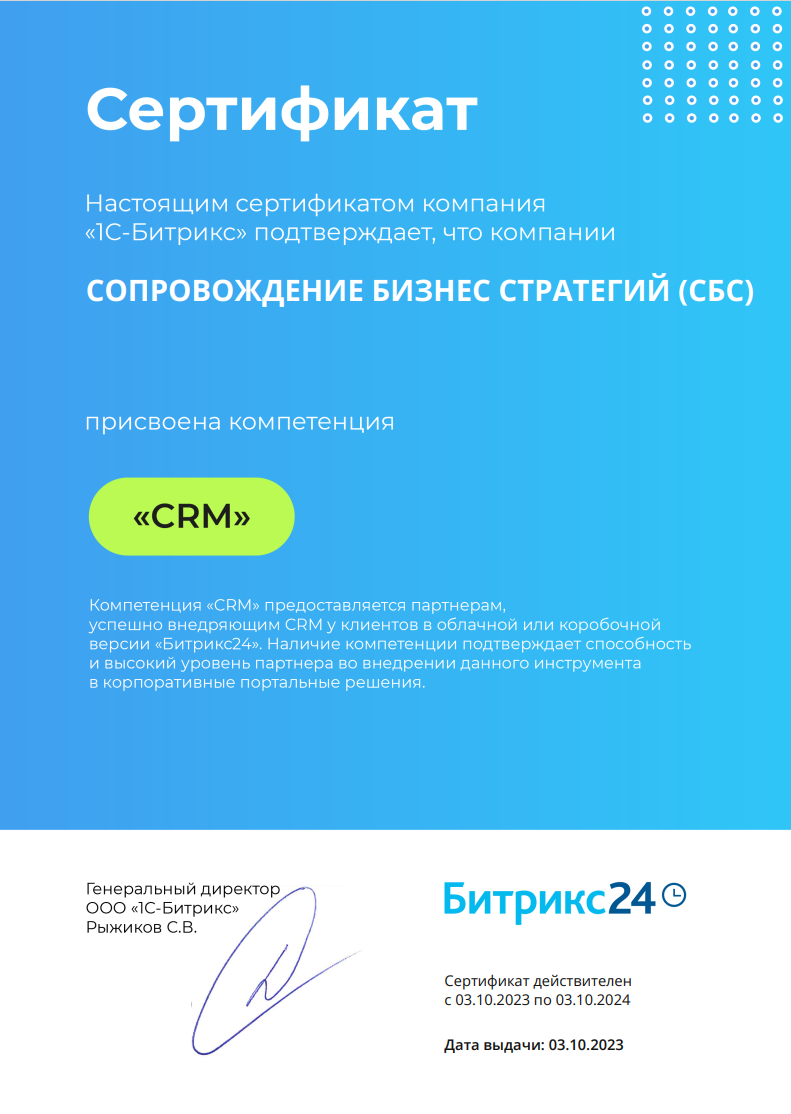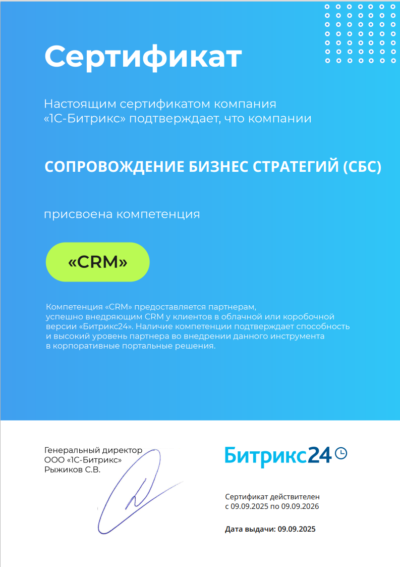 При покупке тарифа в Битрикс24, в документах на оплату укажите команду "Сопровождение Бизнес Стратегий" (ООО "КУФО-Аудит") в качестве партнера Битрикс24, с которым вы работаете. В этом случае вы бесплатно получаете статус клиента СБС на благо вашего бизнеса с выгодой и всеми преимуществами качественного внедрения + скидку 25% к услугам СБС и бонусы.
